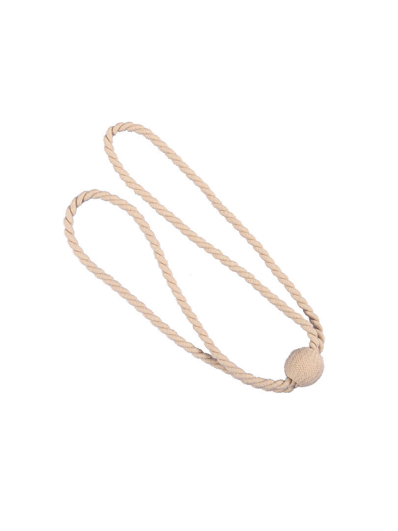 Embrasse van gevlochten koord in een zandkleur. Door de weving heeft de knop in het midden een gebreide look. De knop in het midden kan niet verschoven worden. Beide uiteinden van de embrasse zijn twee grote lussen voor een gemakkelijke bevestiging aan een embrassehaak. De embrasse heeft een totale lengte (recht gemeten) van 60cm.