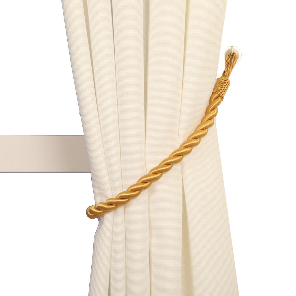 Glanzende cremekleurige embrasse van een gedraaid koord. Mooie soepele kwaliteit waarvan de uiteinden omwikkeld zijn met dunner gedraaid koord. Volledige lengte embrasse 81 cm incl. lussen. De dikte van het koord is 2 cm.
