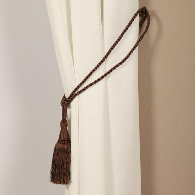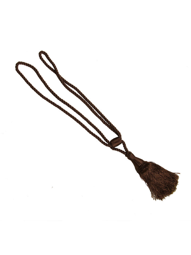 Donkerbruine embrasse met een grote kwast en twee lange lussen. De volledige lengte van de embrasse is ongeveer 65 cm. De lengte van de kwast tot het begin van het koord is 20 cm. Deze embrasse is te gebruiken in combinatie met een embrassehaak.