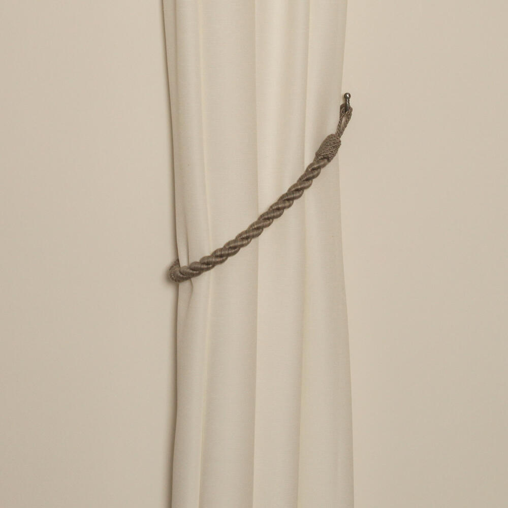 Zijdematte warmgrijze embrasse van een gedraaid koord. Mooie zachte kwaliteit waarvan de uiteinden omwikkeld zijn met dunner gedraaid koord. Deze embrasse dient te worden gebruikt in combinatie met een embrassehaak. Volledige lengte embrasse 80 cm incl. lussen.
