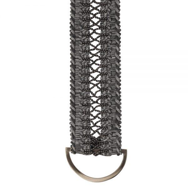 Brede stoffen embrasse in een grijze kleur. Breedte van het band is 6,8cm. De lengte van de embrasse tussen de metalen ringen is 71,5cm. De totale lengte inclusief ringen is 79cm. De uiteinden van de embrasse zijn voorzien van een metalen ring.