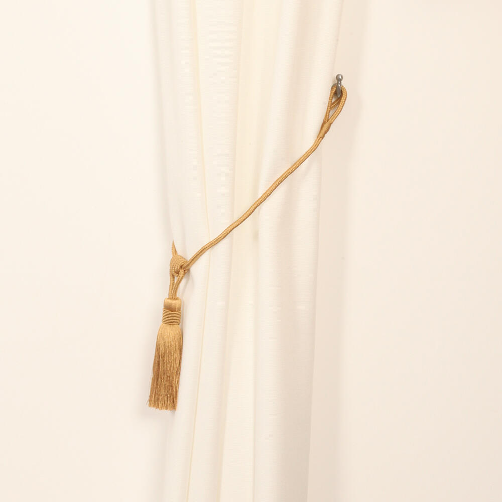 Glanzende embrasse in een goudbruine kleur met een kwast aan het uiteinde. De totale lengte van de embrasse is 52 centimeter. De lengte van de kwast inclusief knoop is 19 centimeter. De embrasse heeft een fijne gevlochten textuur.