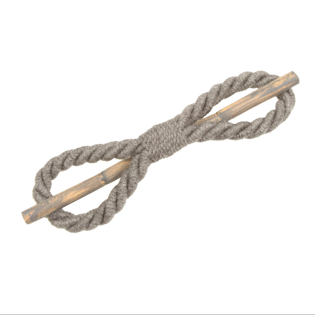 Een eigentijdse embrasse van gedraaid koord in vlindervorm met bamboe stok. In verband met de lengte van de embrasse is deze geschikt voor lichtere gordijnen of Inbetweens en voor smallere ramen. De embrasse zelf is ongeveer 22cm, het bamboestokje om de embrasse vast te zetten is ongeveer 24 cm.