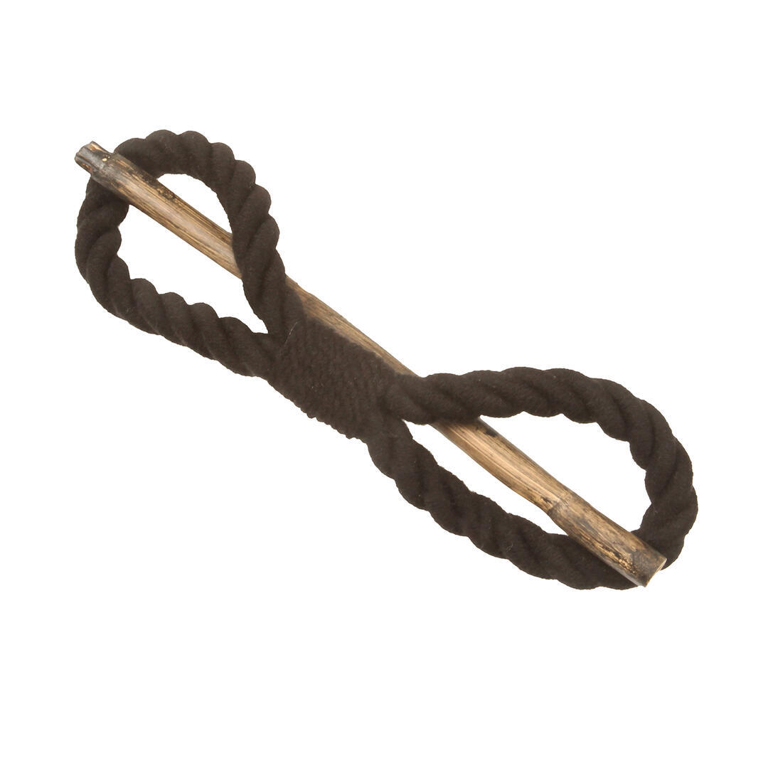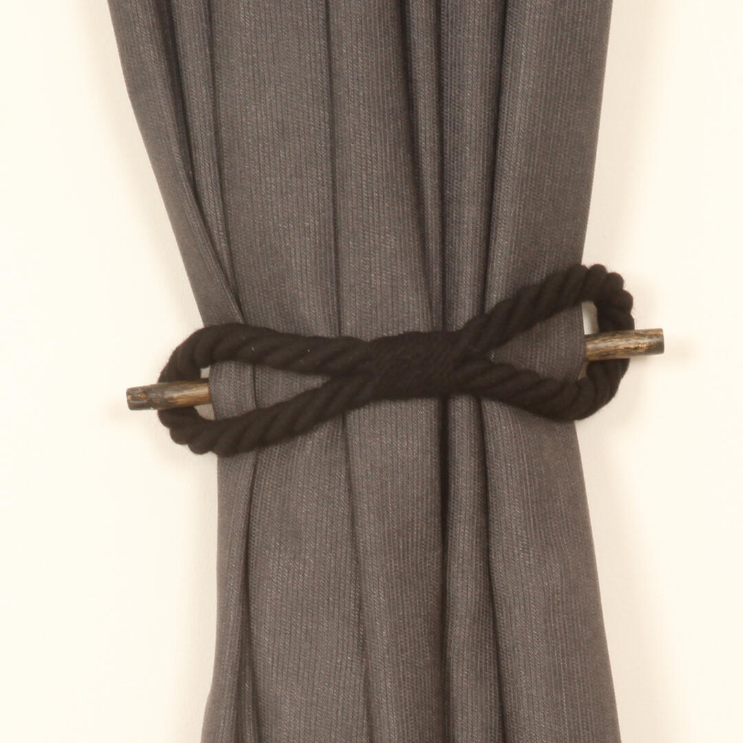 Een eigentijdse embrasse van gedraaid koord in vlindervorm met bamboe stok. In verband met de lengte van de embrasse is deze geschikt voor lichtere gordijnen of Inbetweens en voor smallere ramen. De embrasse zelf is ongeveer 22cm, het bamboestokje om de embrasse vast te zetten is ongeveer 24 cm.