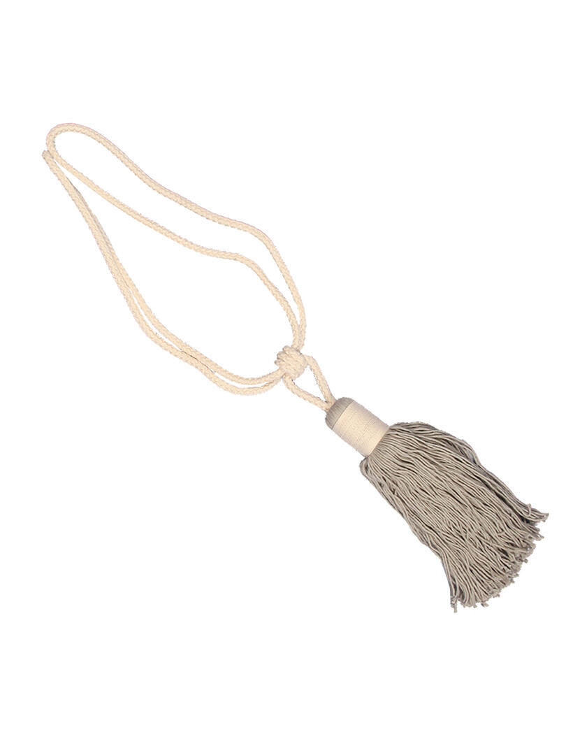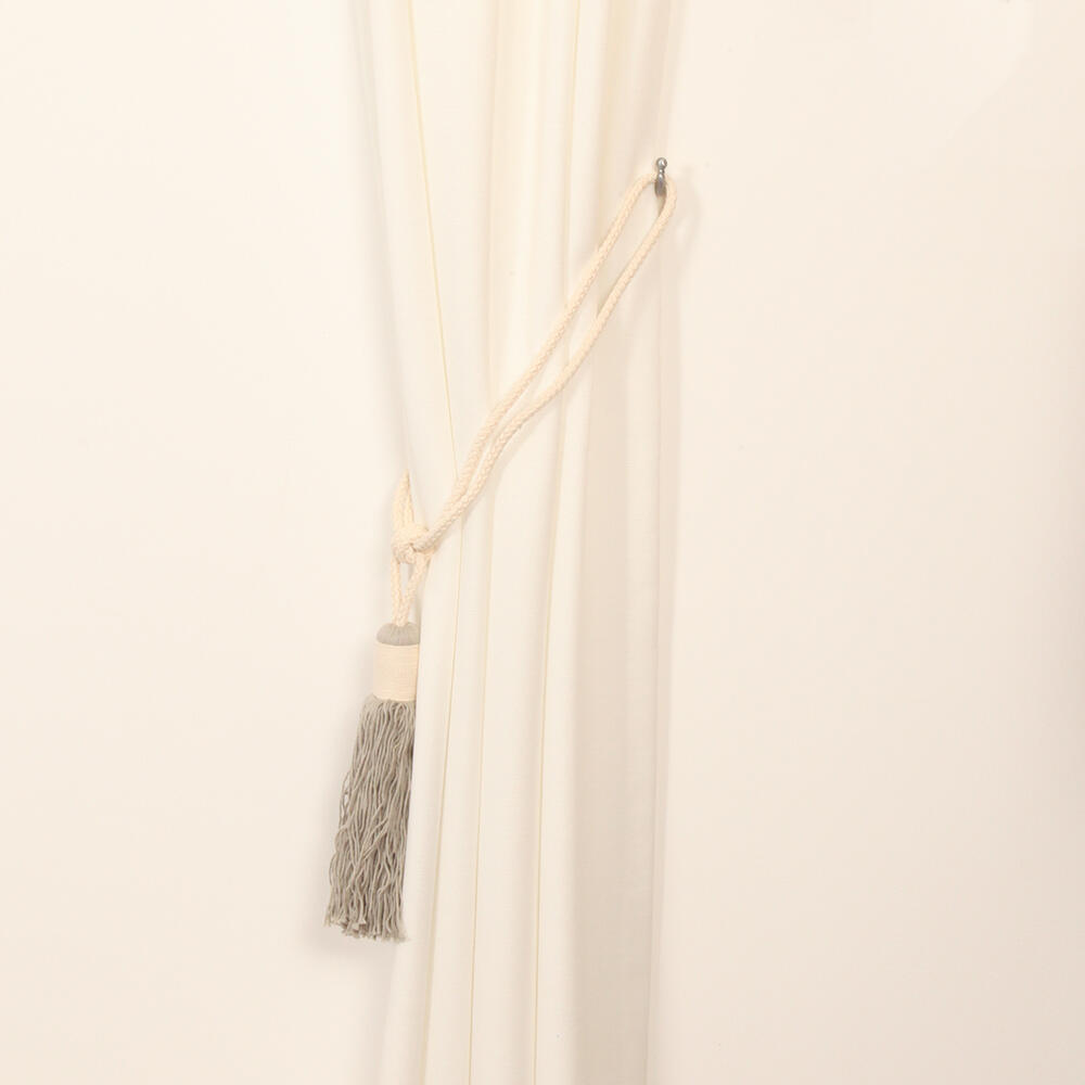 Robuuste embrasse van bijzonder gevlochten koordlussen. De ophanglussen hebben een lengte van 37cm vanaf de knoop. De kwast heeft een lengte vanaf bobvenzijde knoop tot onderaan van 32cm. De kwast is afgewerkt met een rand in linnenbruin. De koorden zijn gemaakt van dikkere katoendraden met een dikte van 2mm. Een prachtige embrasse voor grotere gordijnpakketten met een natuurlijke uitstraling.