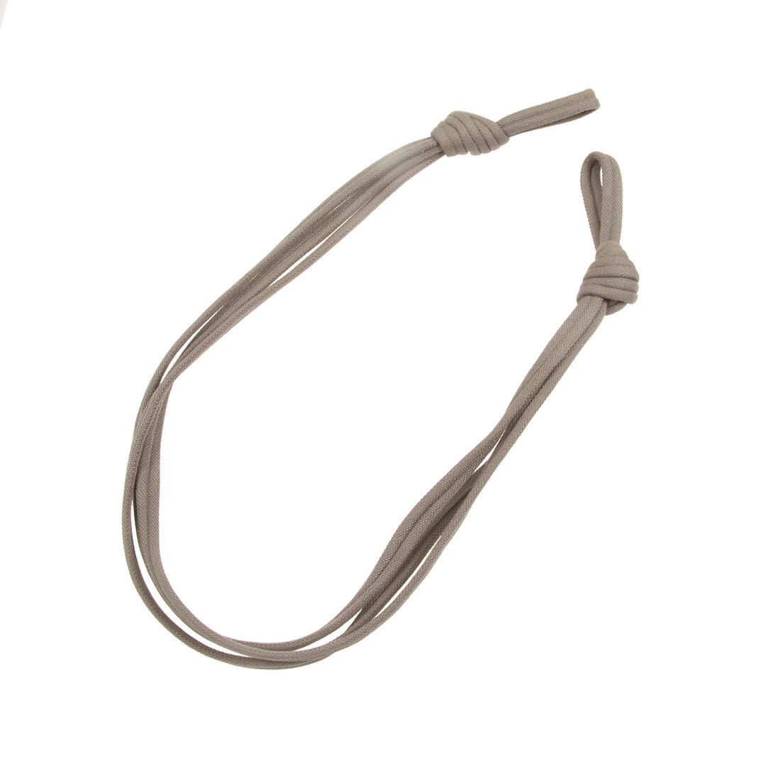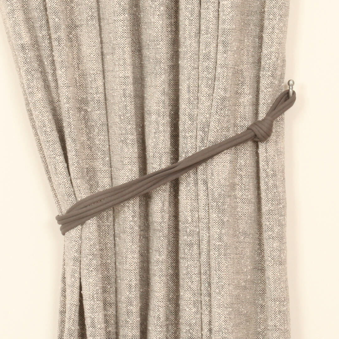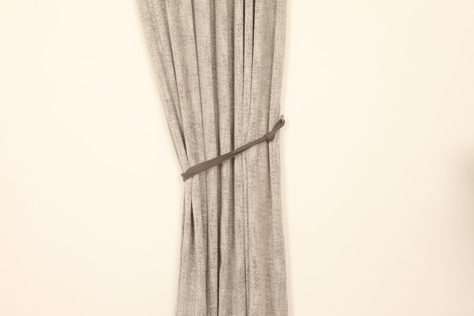 Bijzondere embrasse met een "linnen" look. Deze embrasse heeft 3 koorden die onder elkaar hangen om het gordijn tegen te houden. de koorden hebben een dikte van 3mm en zijn 1,2cm breed. Elke koord heeft een ingestikte naad waardoor een effect onstaat alsof het een dubbel koord lijkt. Aan het uiteinde bij de bevestigingslus zit een knoop. De lengte van de embrasse is ongeveer 85cm. De bevestigingslus is ongeveer 5,5cm en de knoop is ongeveer 4,5cm.