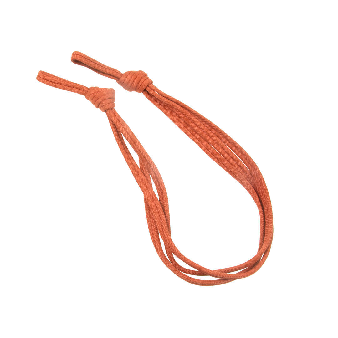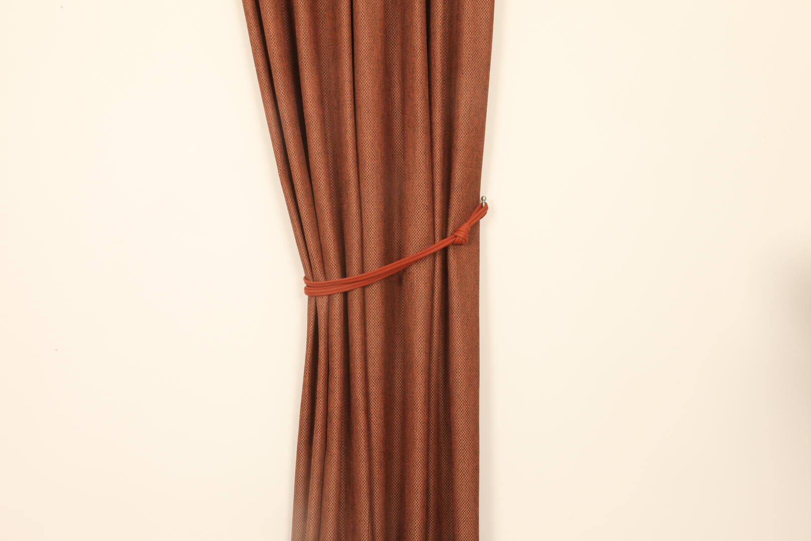 Bijzondere embrasse met een "linnen" look. Deze embrasse heeft 3 koorden die onder elkaar hangen om het gordijn tegen te houden. de koorden hebben een dikte van 3mm en zijn 1,2cm breed. Elke koord heeft een ingestikte naad waardoor een effect onstaat alsof het een dubbel koord lijkt. Aan het uiteinde bij de bevestigingslus zit een knoop. De lengte van de embrasse is ongeveer 85cm. De bevestigingslus is ongeveer 5,5cm en de knoop is ongeveer 4,5cm.