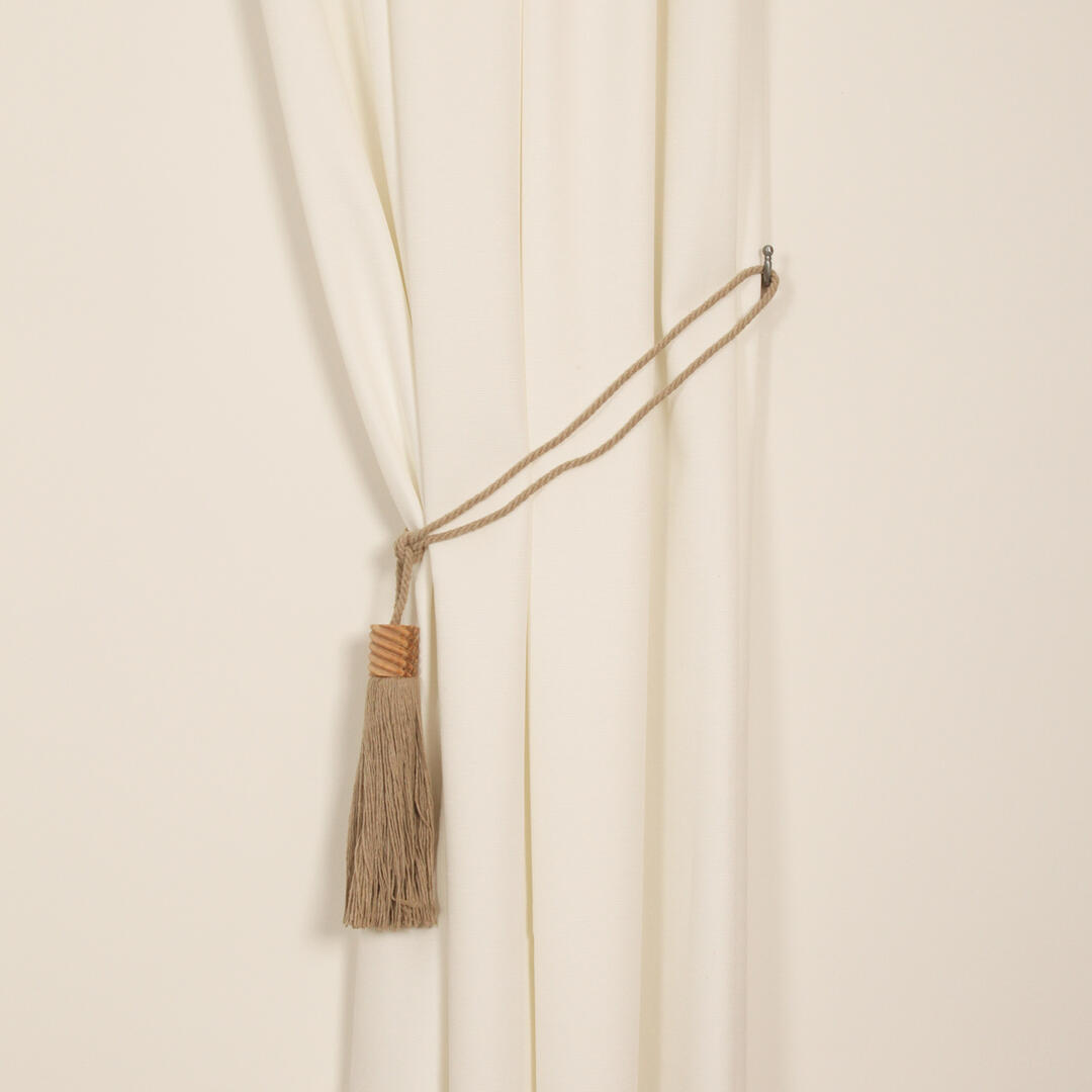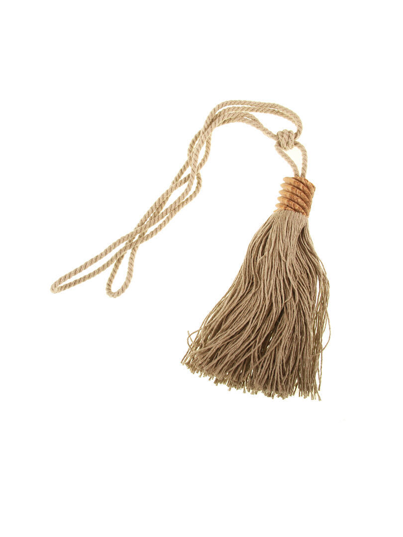 Embrasse van een gedraaid mat koord met kwast. Voorzien van een houten detail boven de kwast. De lengte van de knoop tot de onderzijde van de kwast is 25 cm. Luslengte vanaf de knoop tot het einde van de lus is 40 cm. De koorddikte is 0,7 cm.