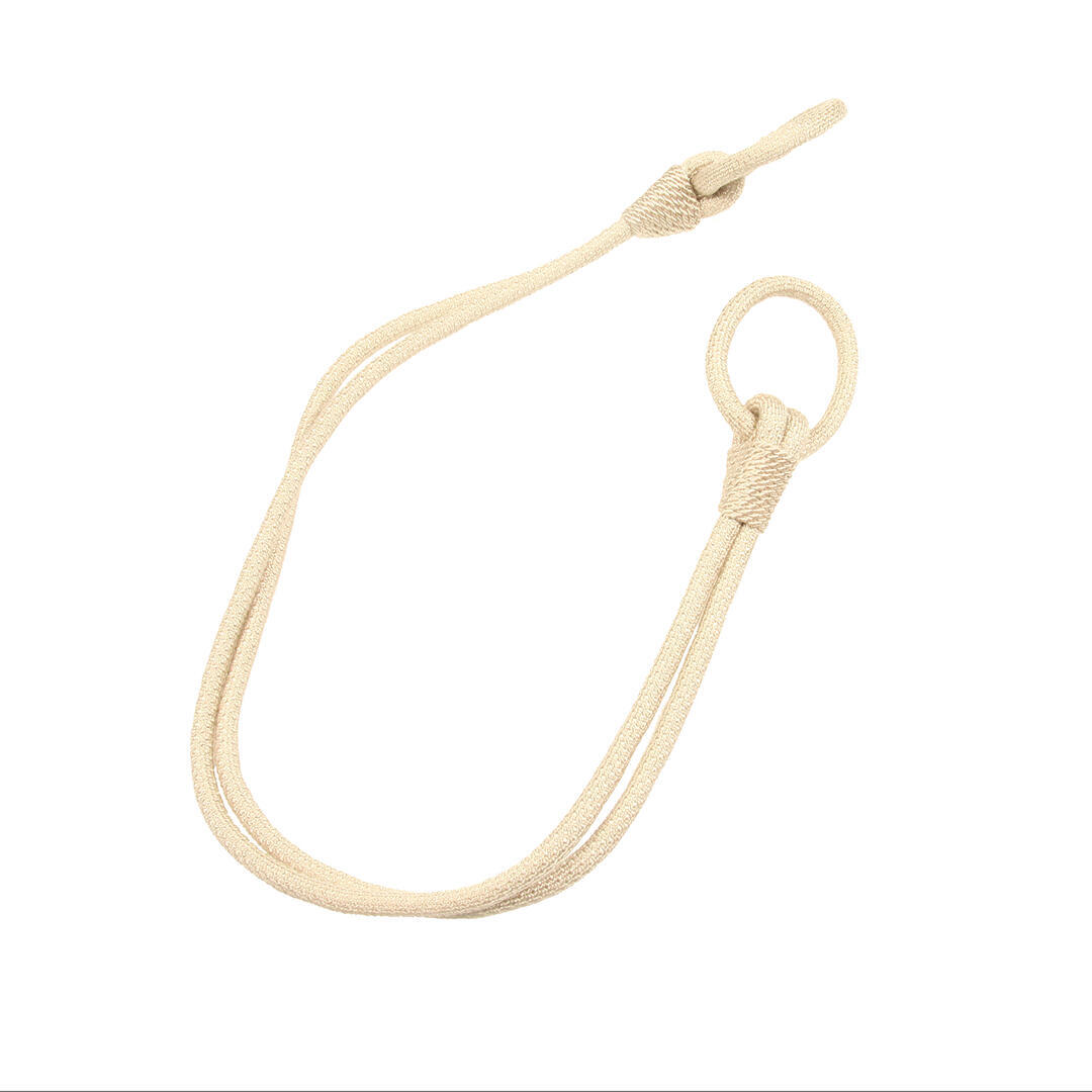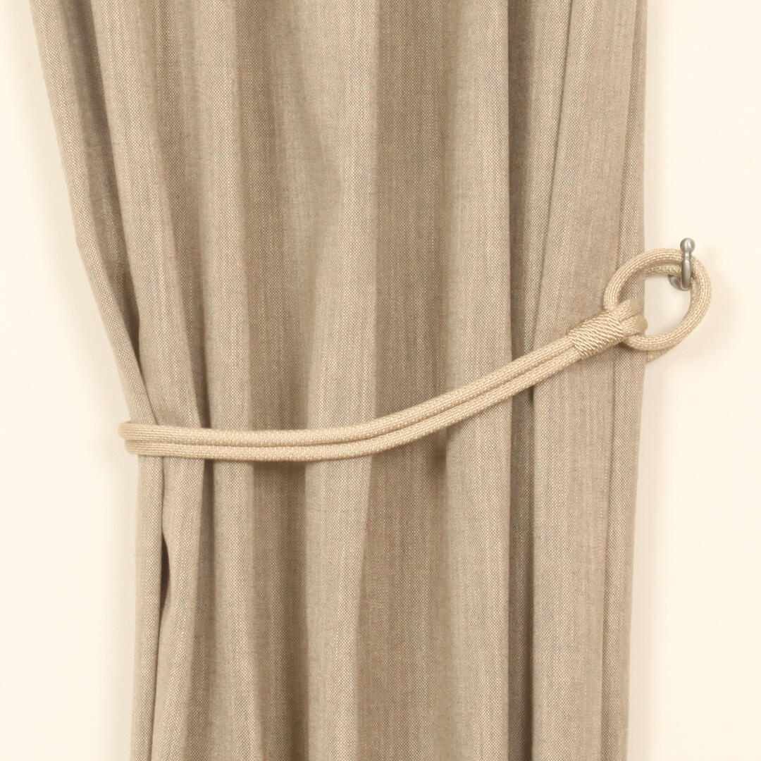 Een mooie embrasse van een dikker gevlochten koord in een lichtglanzend garen. De embrasse bevestig je met ringen aan het gordijn. De ringen zijn gemaakt van ditzelfde koord. Het koord heeft een dikte van 1cm en een lengte van 63cm. De totale lengte van de embrasse inclusief de ringen is 80cm.