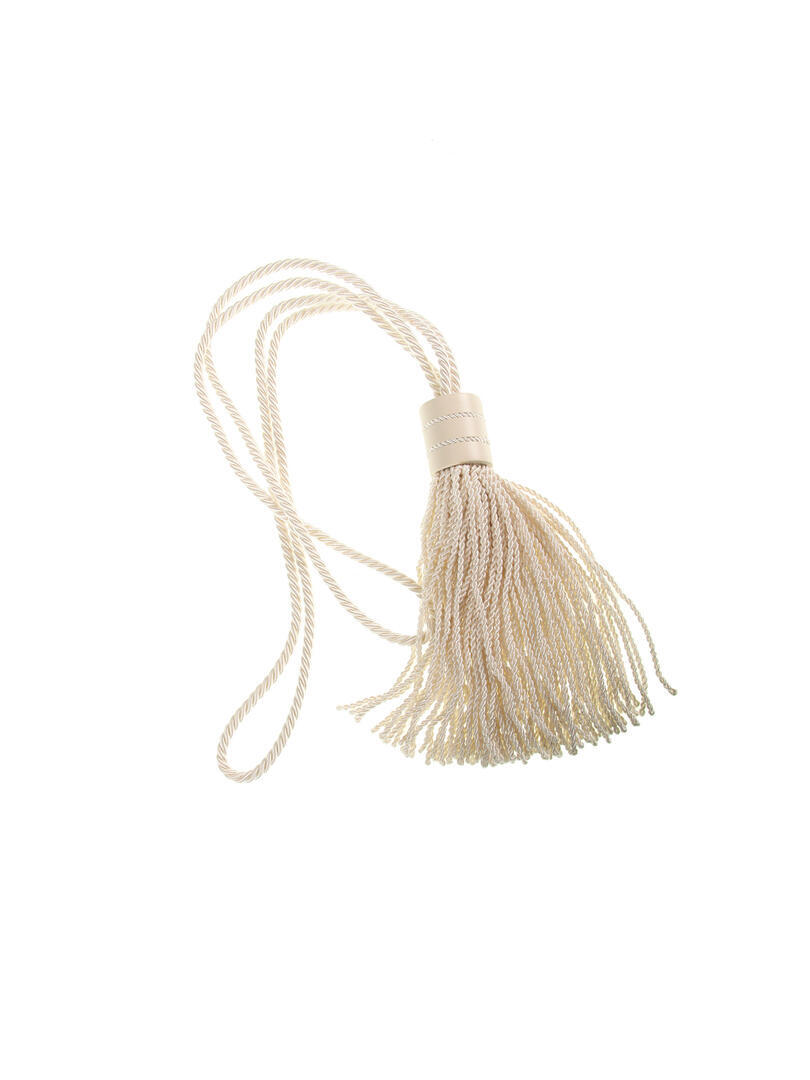 Embrasse van een gedraaid glanzend koord met kwast. Voorzien van een op kleur gelakt houten detail boven de kwast. Lengte van knoop tot onderzijde kwast is 25 cm. Luslengte vanaf knoop tot einde lus is 49 cm. Koorddikte 0,7 cm.