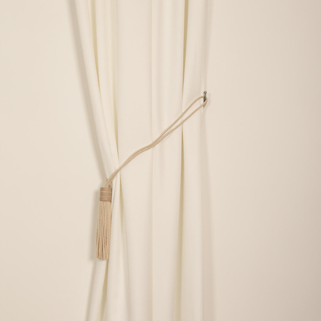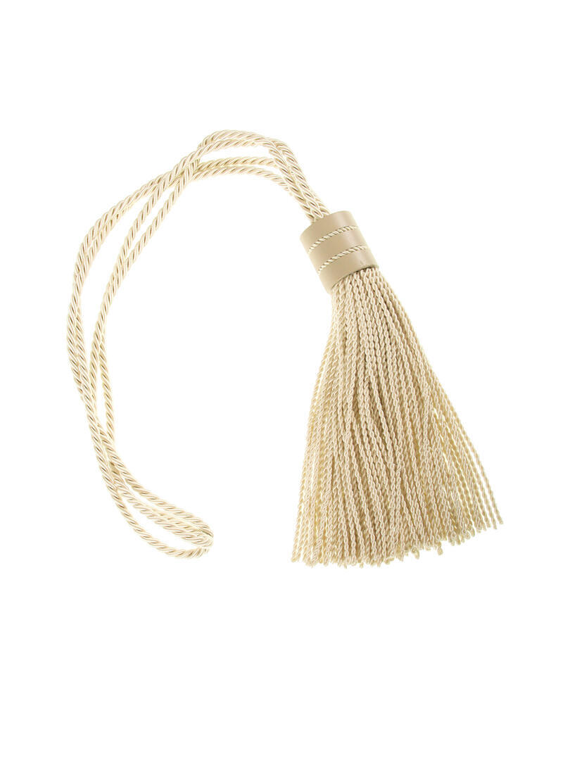 Embrasse van een gedraaid glanzend koord met kwast. Voorzien van een op kleur gelakt houten detail boven de kwast. Lengte van knoop tot onderzijde kwast is 25 cm. Luslengte vanaf knoop tot einde lus is 49 cm. Koorddikte 0,7 cm.