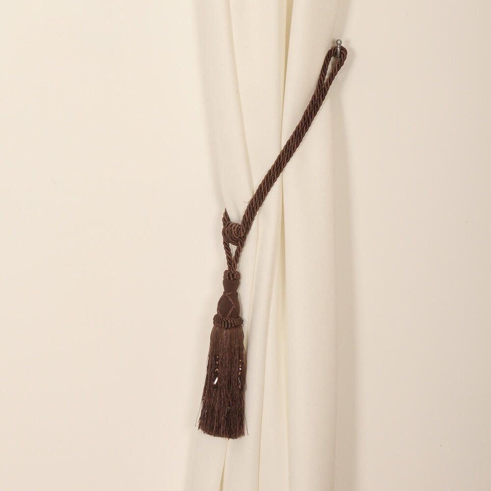 Glanzende bruine embrasse van gedraaide koorden. De kwast is ongeveer 26cm lang en voorzien van een decoratieve knop. In de kwast vindt je smalle organzastrookjes waar ook weer kwastjes aan bevestigd zijn. Een prachtige embrasse die past bij veel verschillende gordijnen!