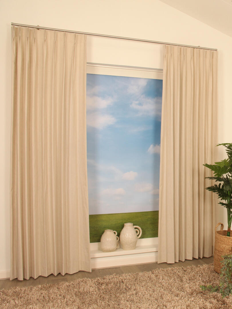 Deze kamerhoge afwerking biedt niet alleen esthetische voordelen, maar zorgt ook voor een betere lichtwering en een verbeterde geluidsisolatie, waardoor je huis een gevoel van sereniteit en rust uitstraalt. Deze stof is Oeko-Tex gecertificeerd.