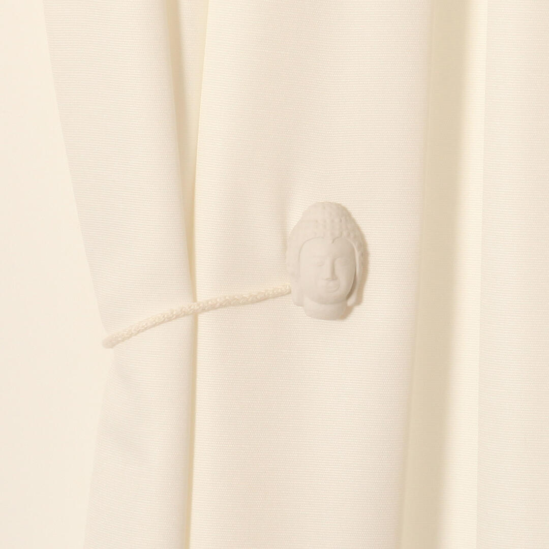 Magneet embrasse met een decoratieve knop in de vorm van een boedha. Een naturel koord verbind de knop met het tweede deel van de magneet die verwerkt is in een naturelle gladde knop. Het koord heeft een dikte van 6mm en een lengte van 33cm. De totale lengte van de embrasse is 38cm. De knop heeft een hoogte van bijna 7cm en een breedte van 4,5cm. De ruwere afwerking geeft de embrasse een verouderde look.