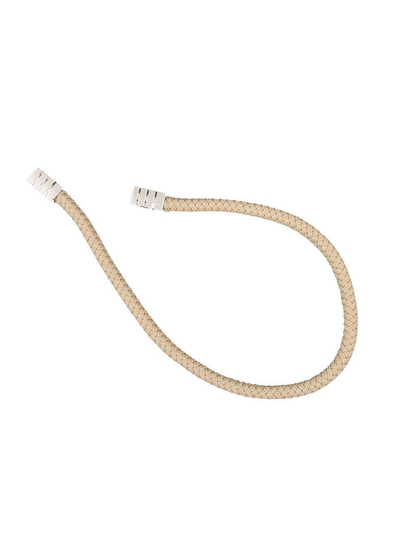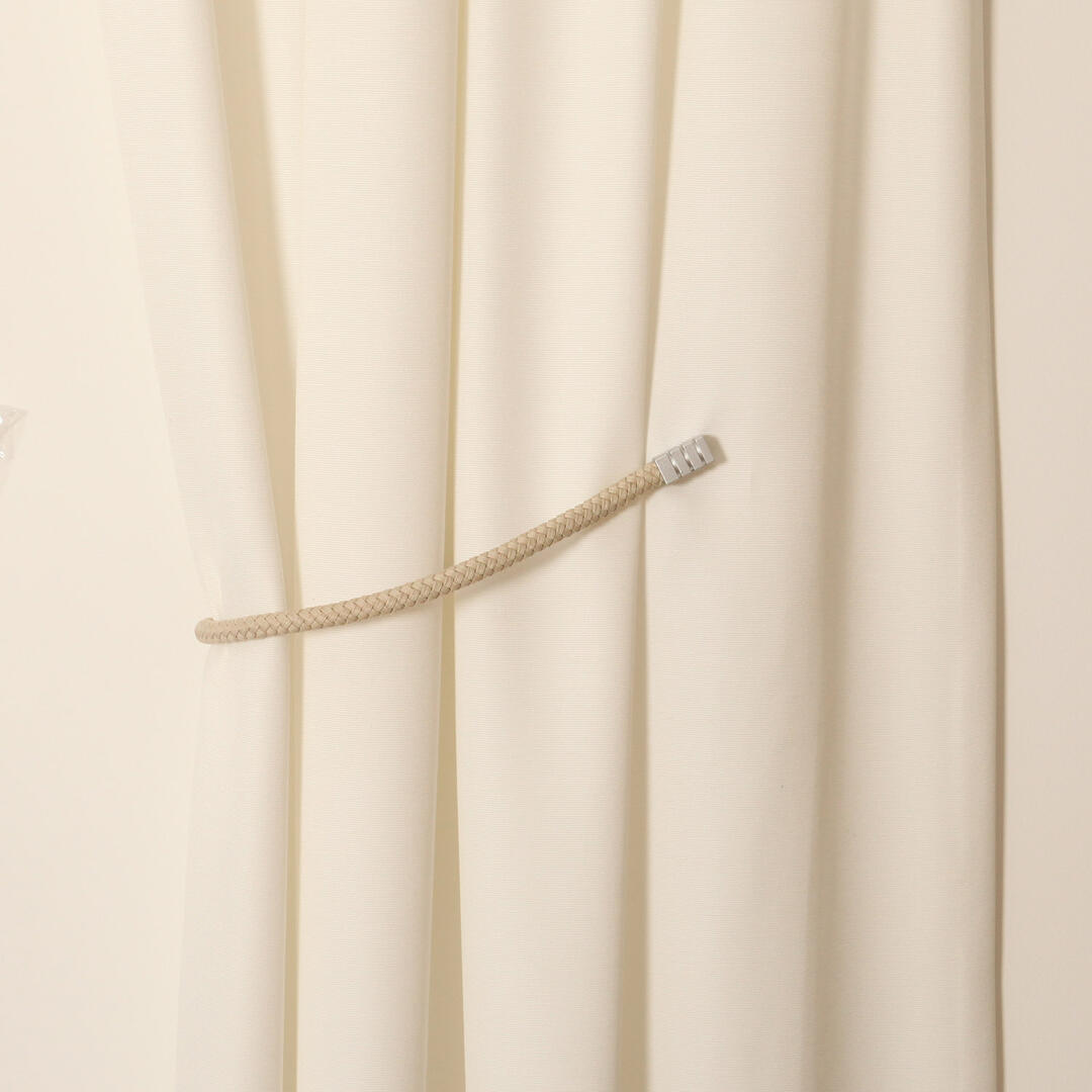 Embrasse van een dikker gevlochten koord in een lichtglanzend garen. Het koord komt uit in een mat zilveren magneethouder met inkepingen. De embrasse wordt met de magneten aan het gordijn bevestigd. Het koord heeft een dikte van 1,4cm en een lengte van 67cm. De totale lengte van de embrasse inclusief de magneethouders is 74cm.