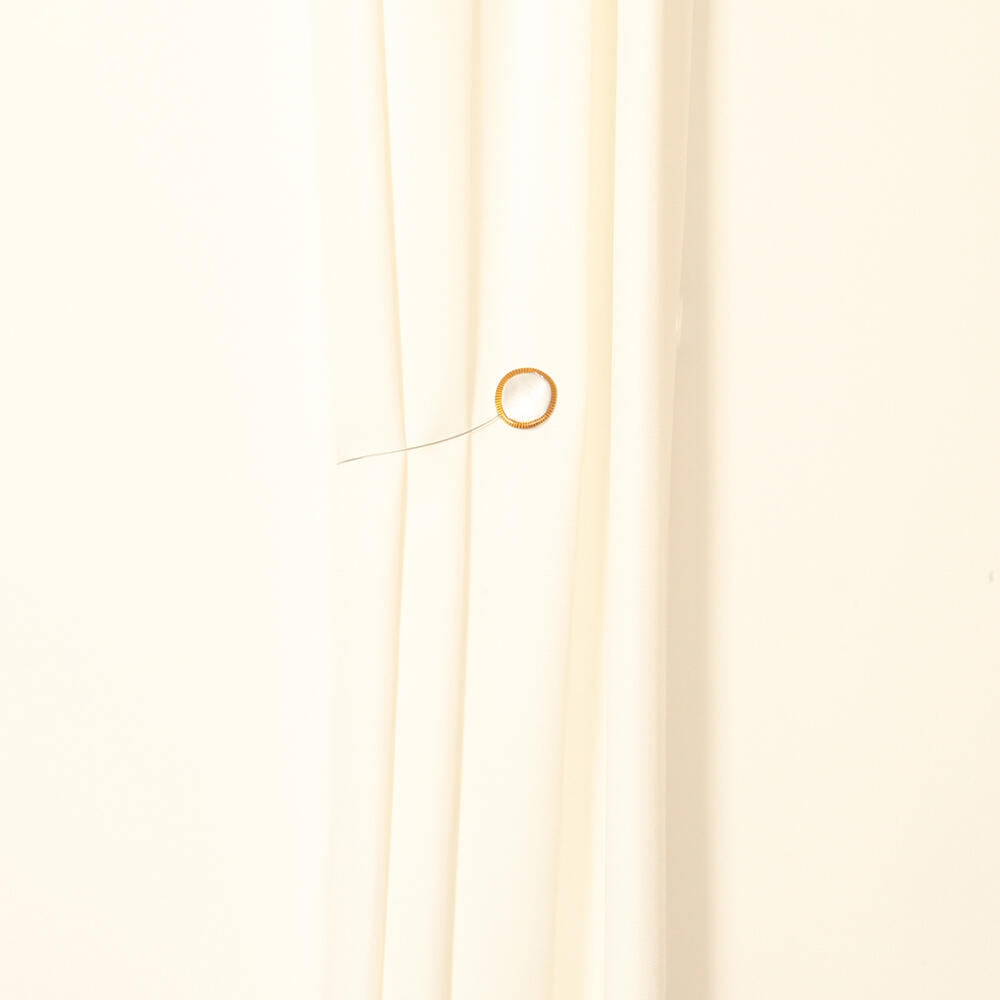 Magneet embrasse uitgevoerd met een staalkabel en metalen knoppen. De knop die aan de voorzijde zichtbaar is in licht geborsteld nikkel uitgevoerd met details in geel. De knop aan de achterzijde is nikkel. De lengte van de staalkabel is 35,5cm. De knop aan de voorzijde heeft een diameter van 5cm. De volledige lengte van de embrasse is 43cm.