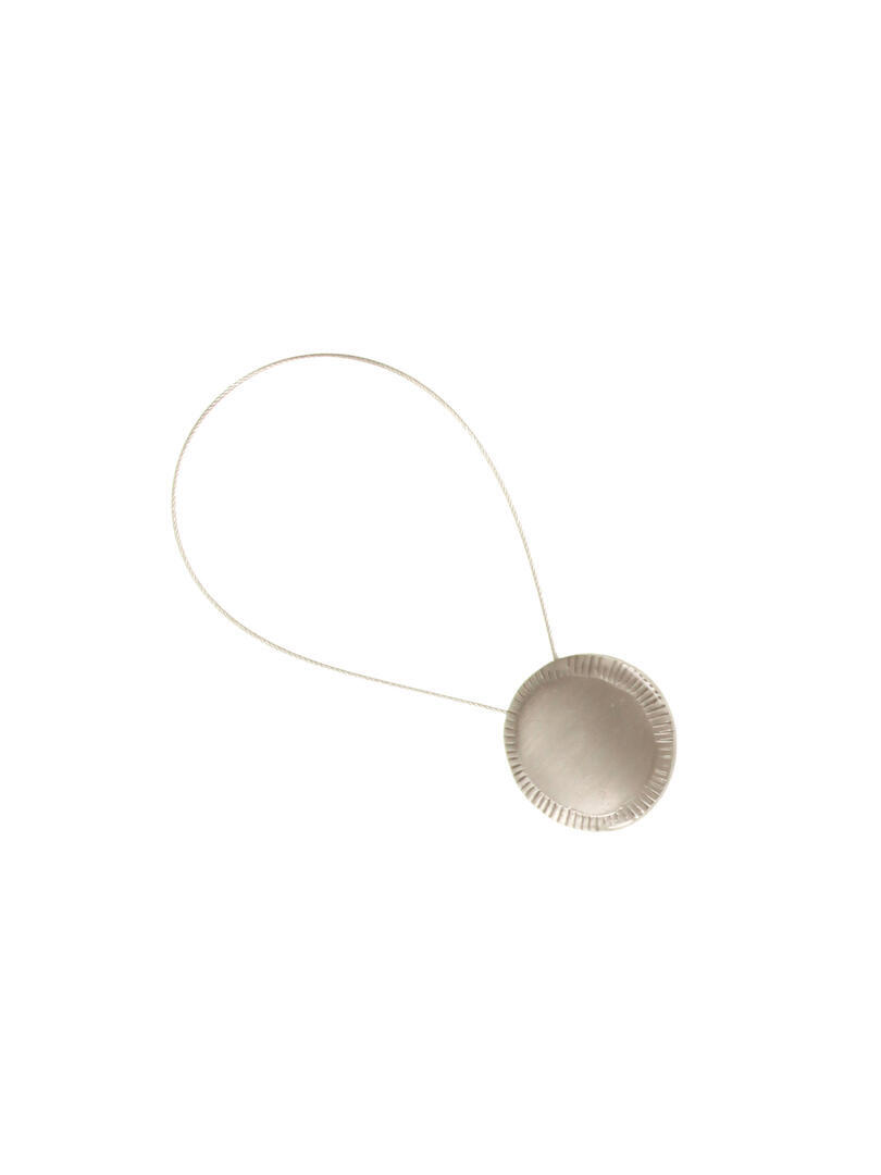 Magneet embrasse uitgevoerd met een staalkabel en metalen knoppen. De knoppen zijn mat nikkel geborsteld. De lengte van de staalkabel is 35,5cm. De knop aan de voorzijde heeft een diameter van 5cm. De volledige lengte van de embrasse is 43cm.