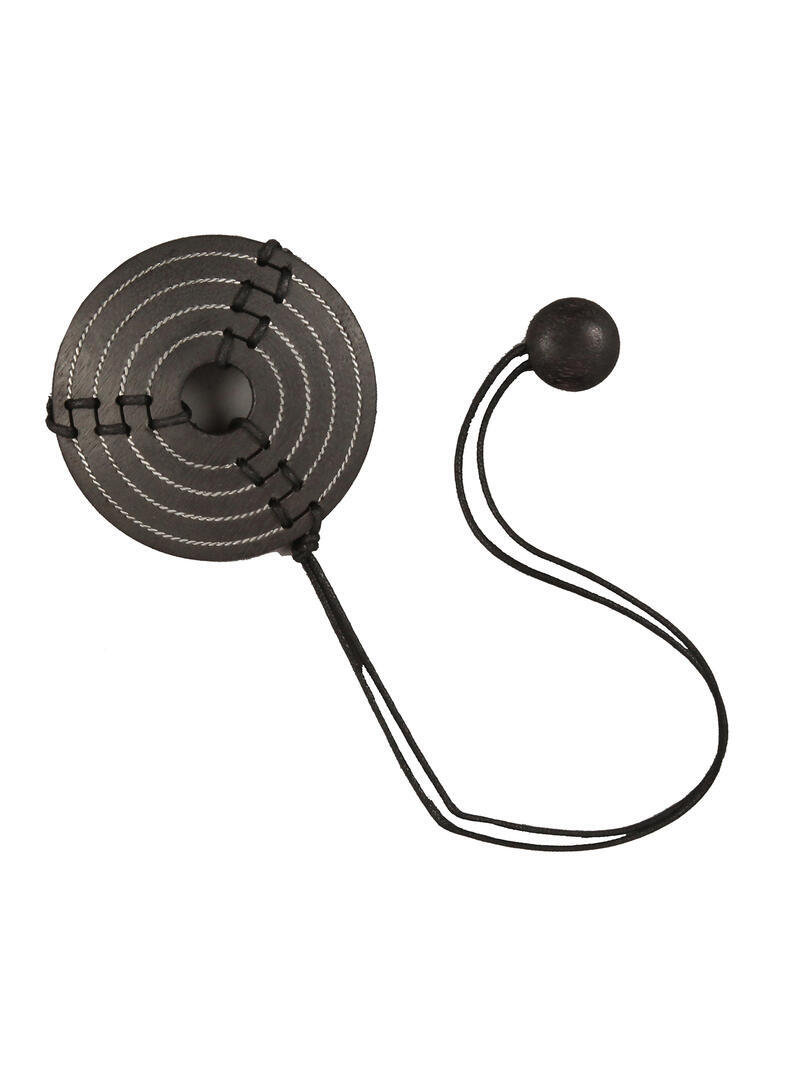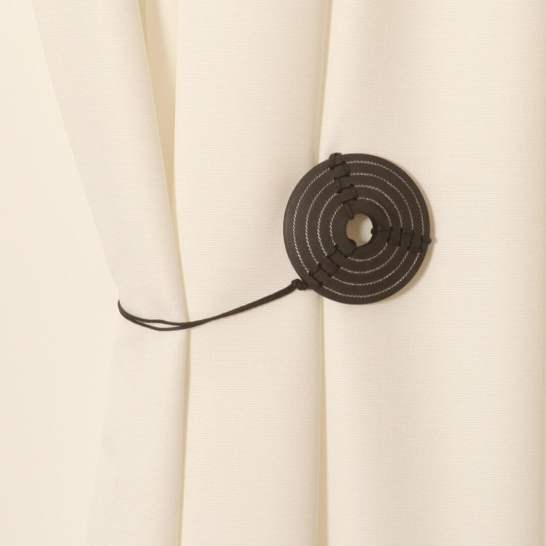 Magneet embrasse uitgevoerd in hout, doorvlochten met zwart koord. Hetzelfde koord vormt de verbinding met het tweede deel van de embrasse. De knop aan de voorzijde is gedecoreerd met ringen van dun, gedraaid, metaal. De houten knop heeft een buitenmaat van 9,5cm en in het midden een opening. Het koord heeft een lengte van 34 cm.