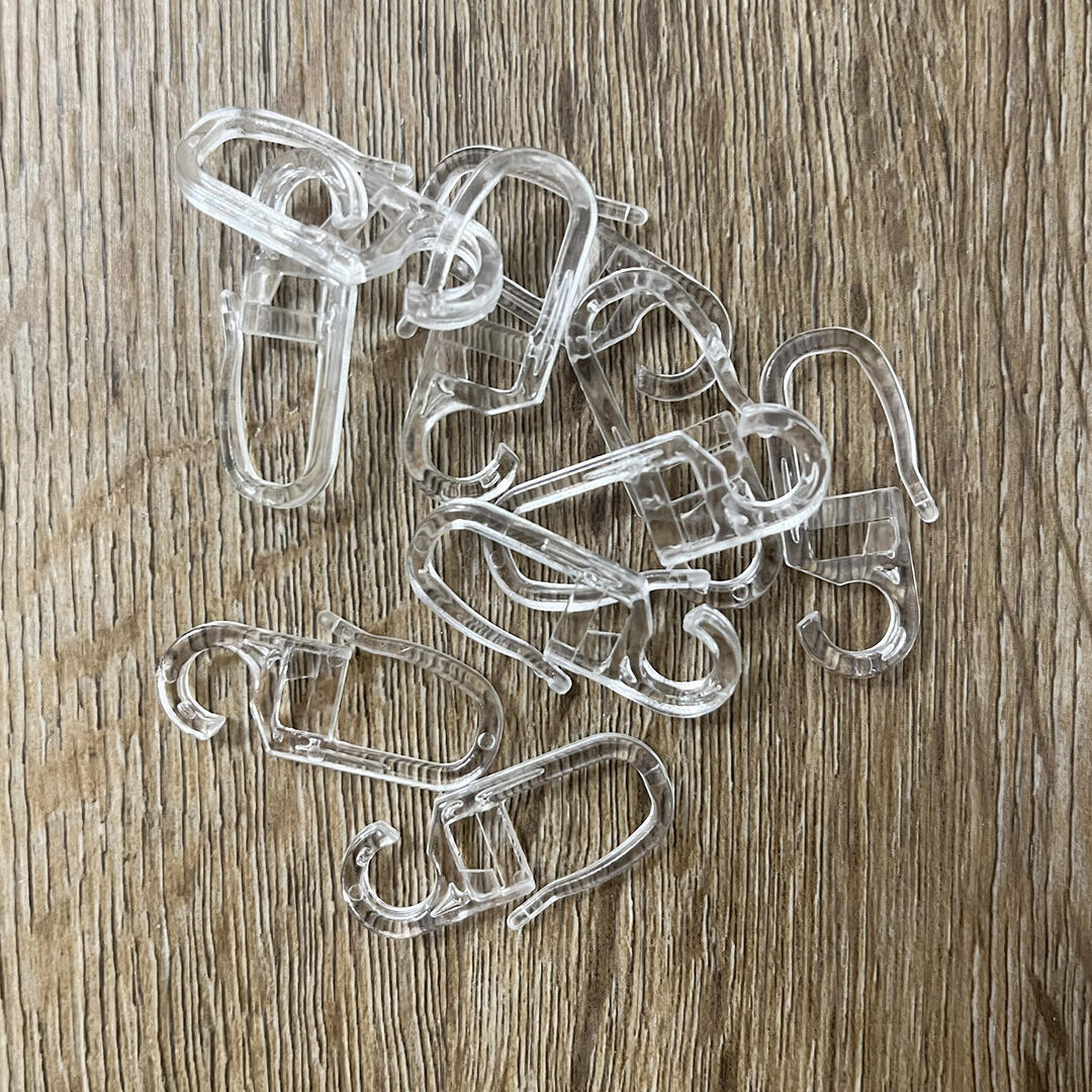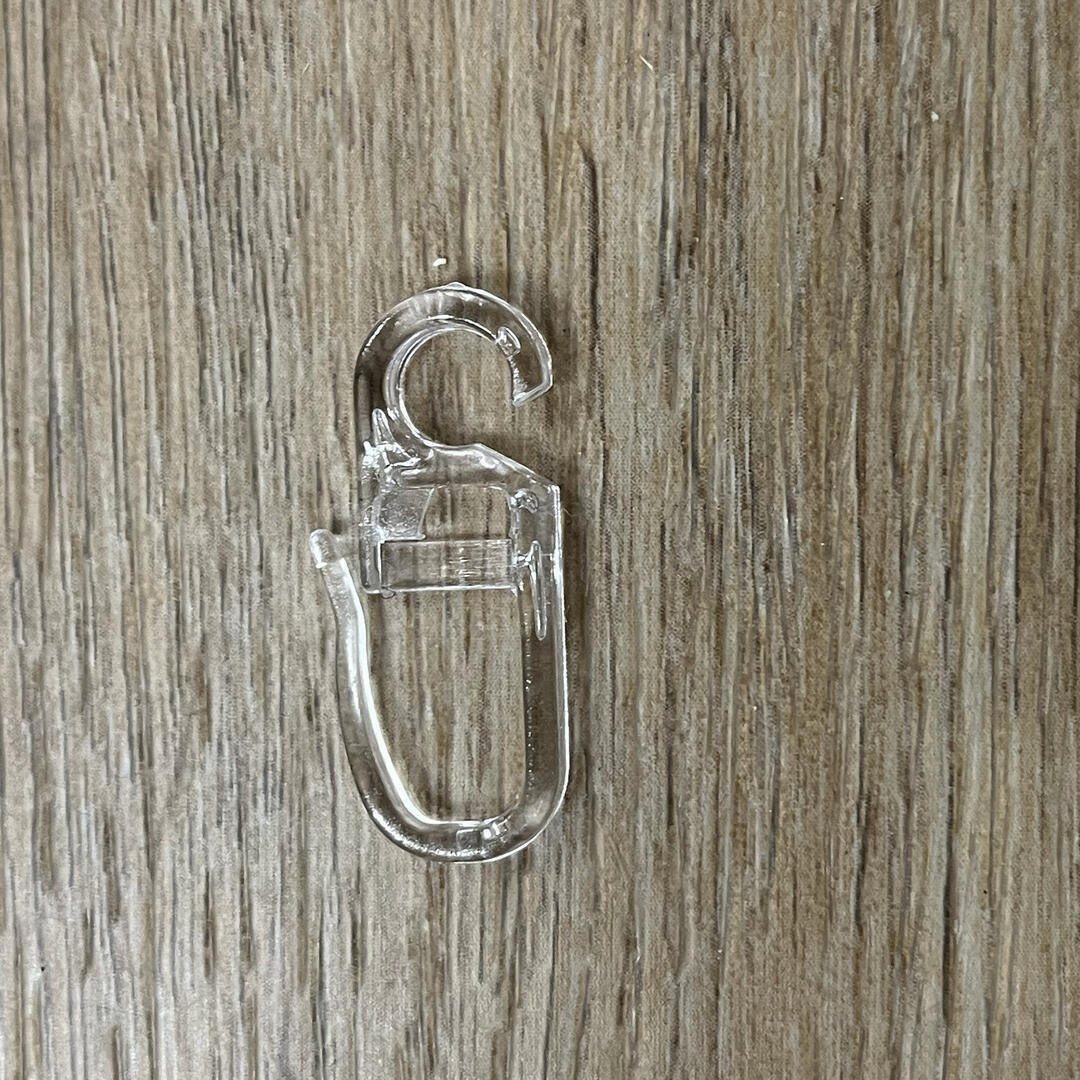 Transparante plooihaken in een set van 10 stuks geschikt voor ringen die gebruikt worden bij roedes van 16mm. Bekijk de foto's voor de maten van deze clip. Deze clip kan gebruikt worden in combinatie met gordijnhaken of met gordijnband dat voorzien is van lusjes.