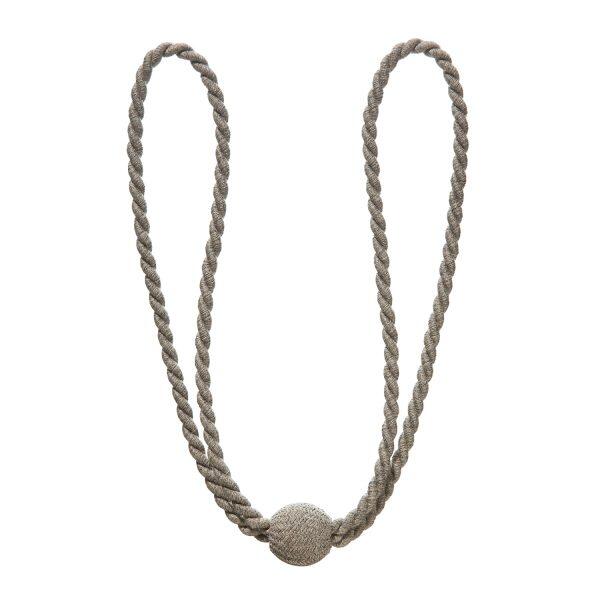 Embrasse van gevlochten koord in een grijsbruine kleur. Door de weving heeft de knop in het midden een gebreide look. De knop in het midden kan niet verschoven worden. Beide uiteinden van de embrasse zijn twee grote lussen voor een gemakkelijke bevestiging aan een embrassehaak. De embrasse heeft een totale lengte (recht gemeten) van 60cm.