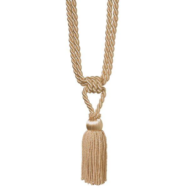 Glanzende embrasse in een beige kleur. Aan het einde van de embrasse zit een kwast bevestigd