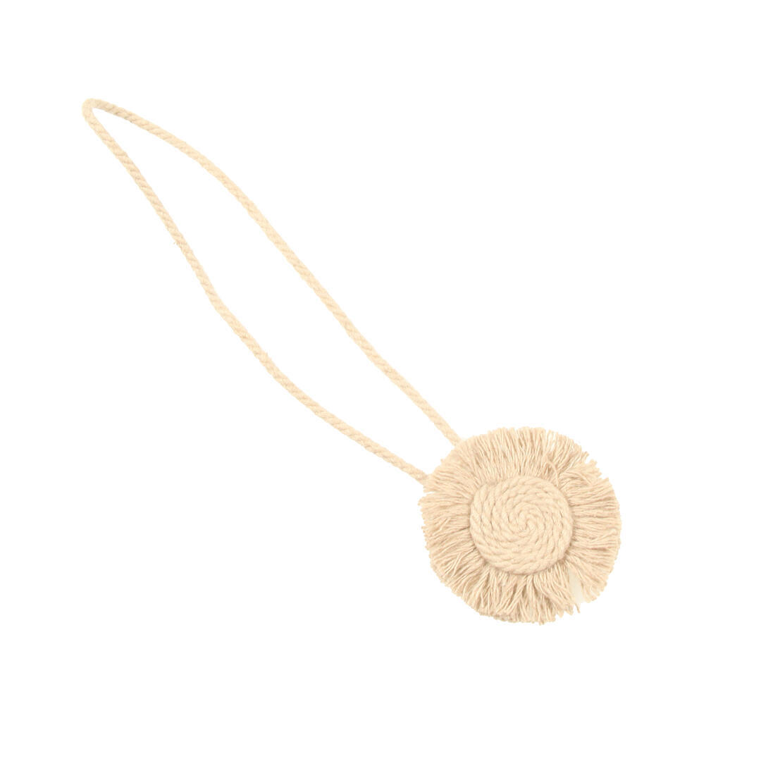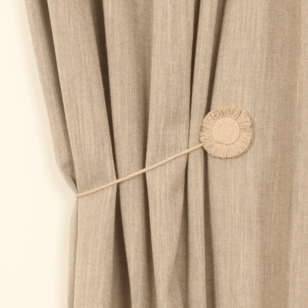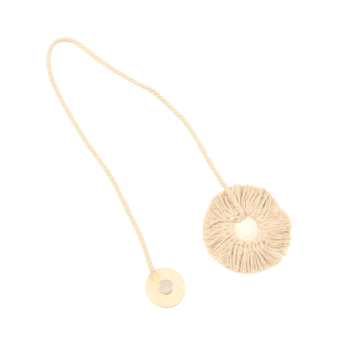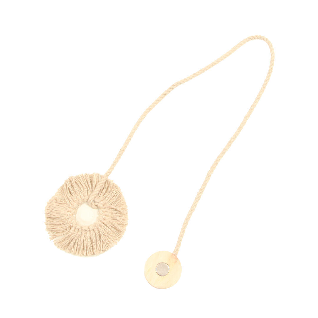 Magneet embrasse van koord met natuurlijke vezels met een rozet van dunnere draden en een hart van hetzelfde koord. Aan de achterzijde en aan het uiteinde zit een kleinere houten knop. Deze zijn beide voorzien van sterke magneten. Het katoenen draad is 43cm lang. De houten knop aan het uiteinde is 2,5cm in diameter. De rozet aan de voorzijde heeft een diameter van 6,5 cm. De totale lengte van de embrasse is 48cm.