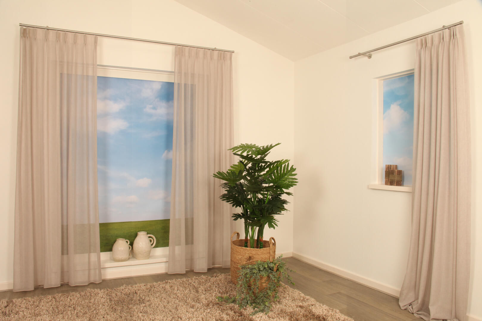 Deze stof is kamerhoog, wat betekent dat deze gordijnen naadloos kunnen worden geconfectioneerd voor een luxe en elegante uitstraling.