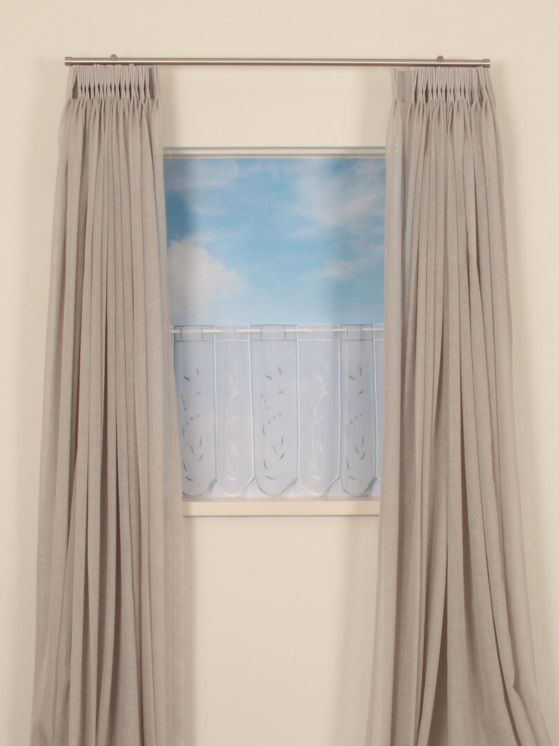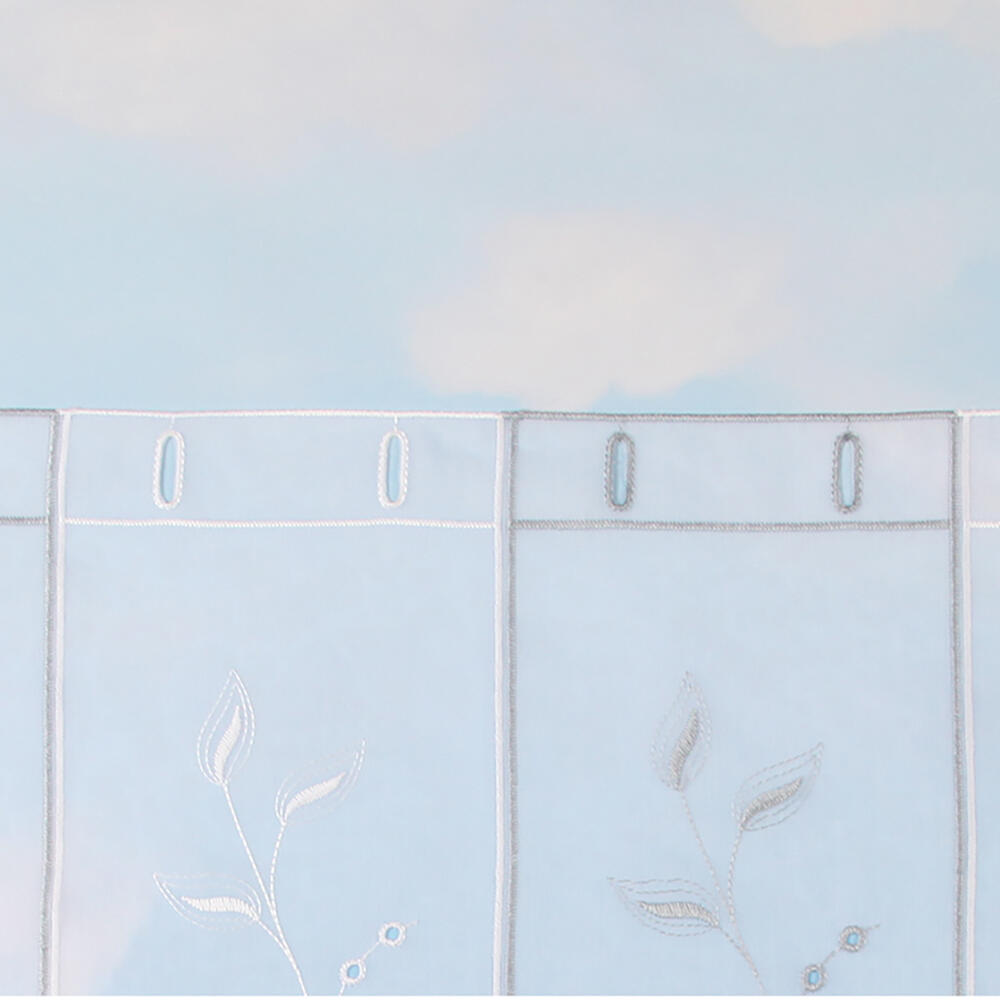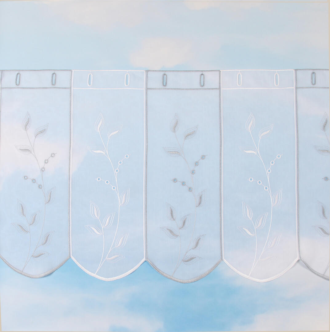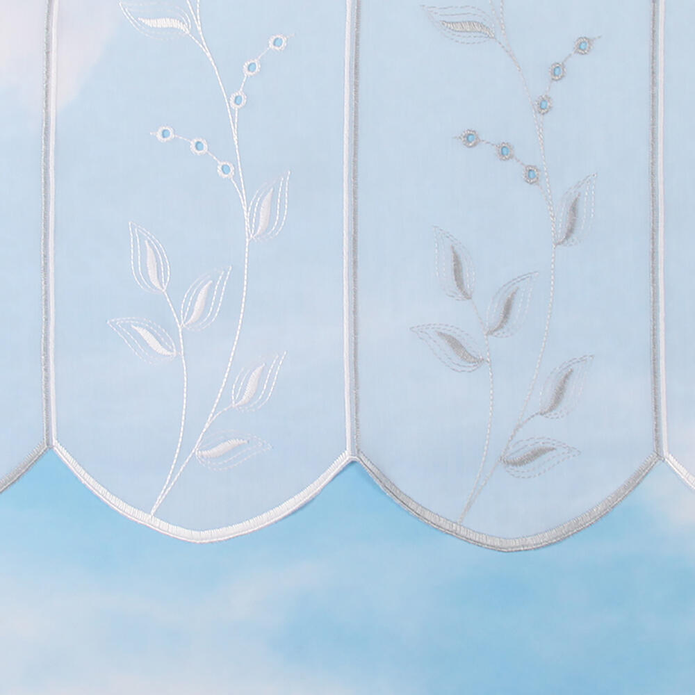 Val Goslar is in de basis gemaakt van een zeer transparante vitrage. De panelen van 16cm breedte zijn afgewerkt met een geborduurde rand, uitgevoerd in glansgaren. Op ieder paneel is een tak met blaadjes geborduurd. De panelen zijn om en om wit en grijs. Deze val is geschikt voor roedes tot 15mm doorsnee.