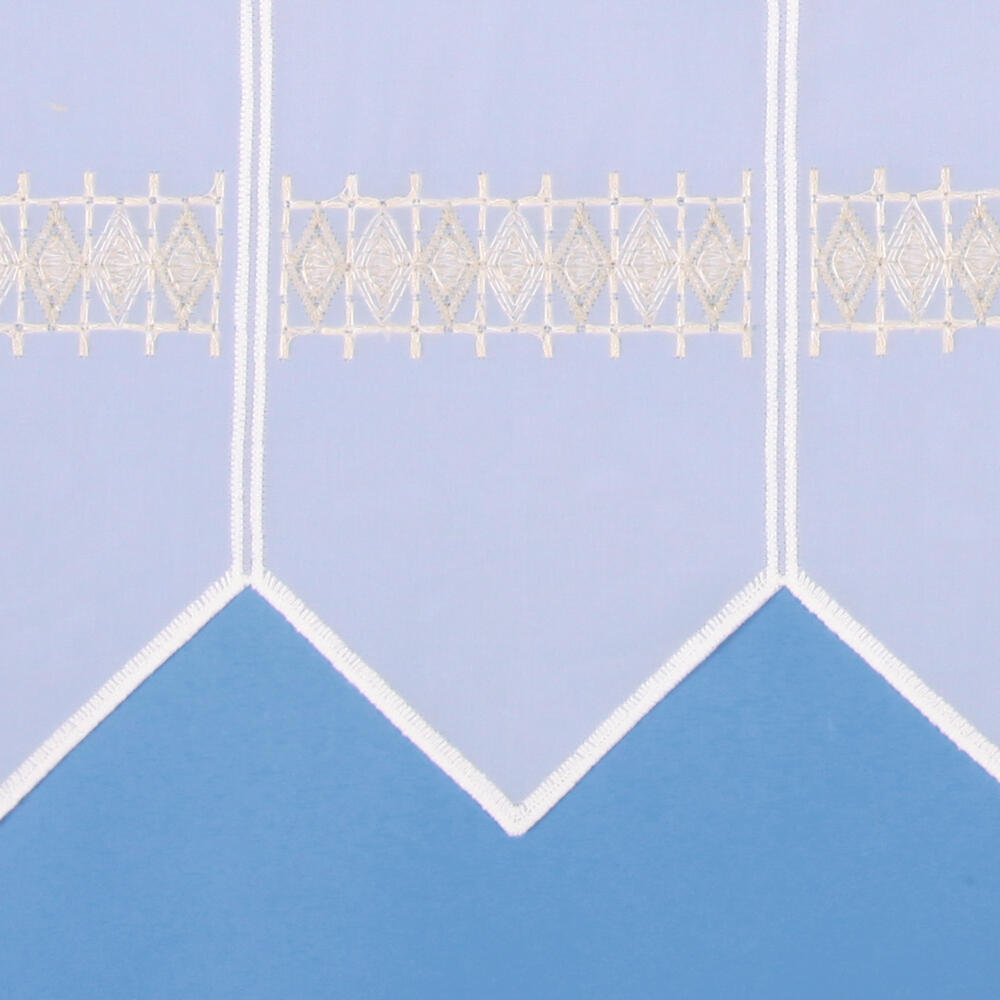 Deze transparante val is gemaakt van panelen van witte voile die geborduurd zijn met een dikker wit garen. In de onderrand is een patroon van ruitjes en lijnen in grijs bruine tinten geweven.