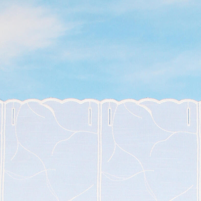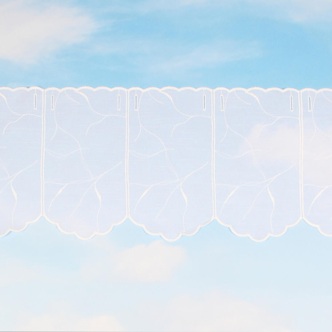 Deze val is gemaakt van een open geweven vitrage. Op de panelen zijn met een matte garen dunne takjes geborduurd. De onder- en bovenkant zijn afgewerkt met een golvend schulprandje. De Segmenten zijn 16 cm breed.