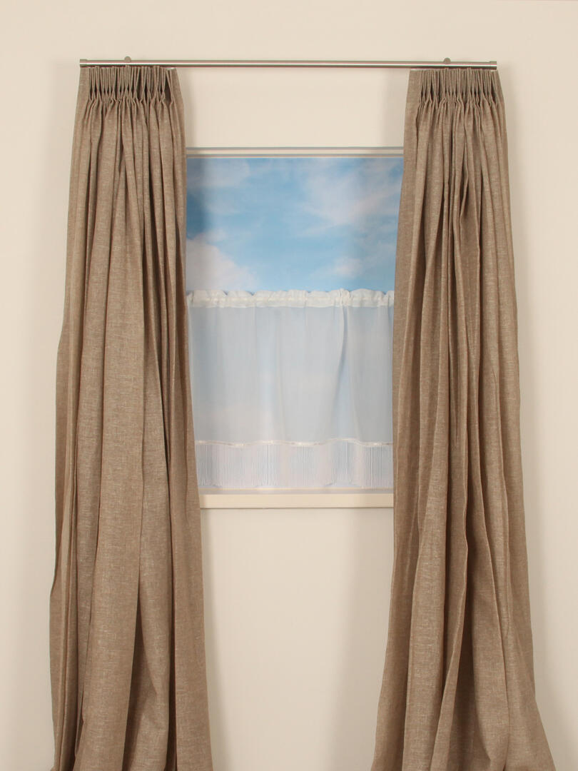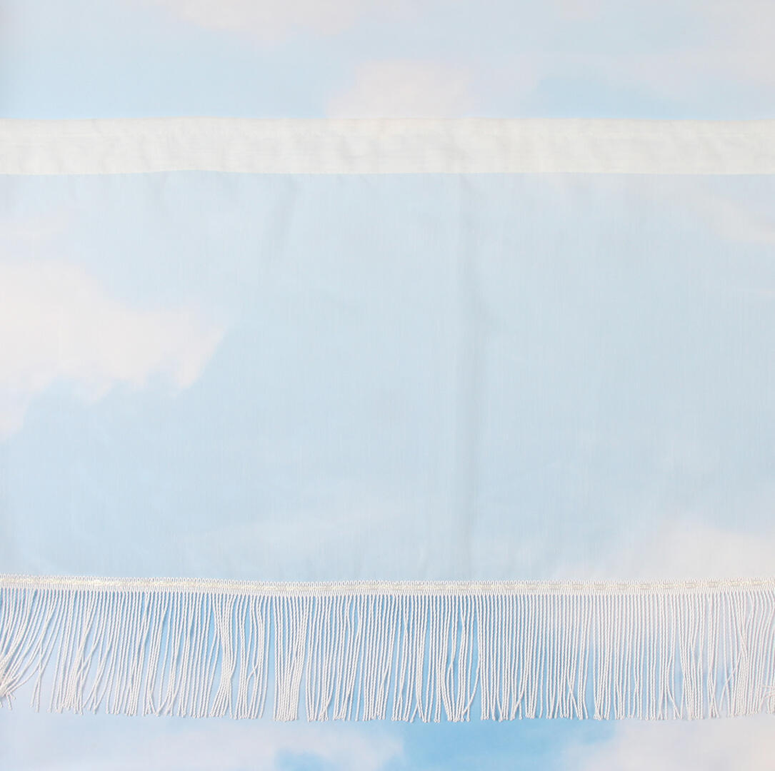 Val Villena is een offwhite vitragestof met een fijn streeppatroon en een rechte franjeband van ongeveer 15 cm. In de rand aan de bovenzijde van de franjeband lijkt alsof er een satijnlint doorheen geregen is. Hierin is ook een parelmoerkleurige draad verwerkt.