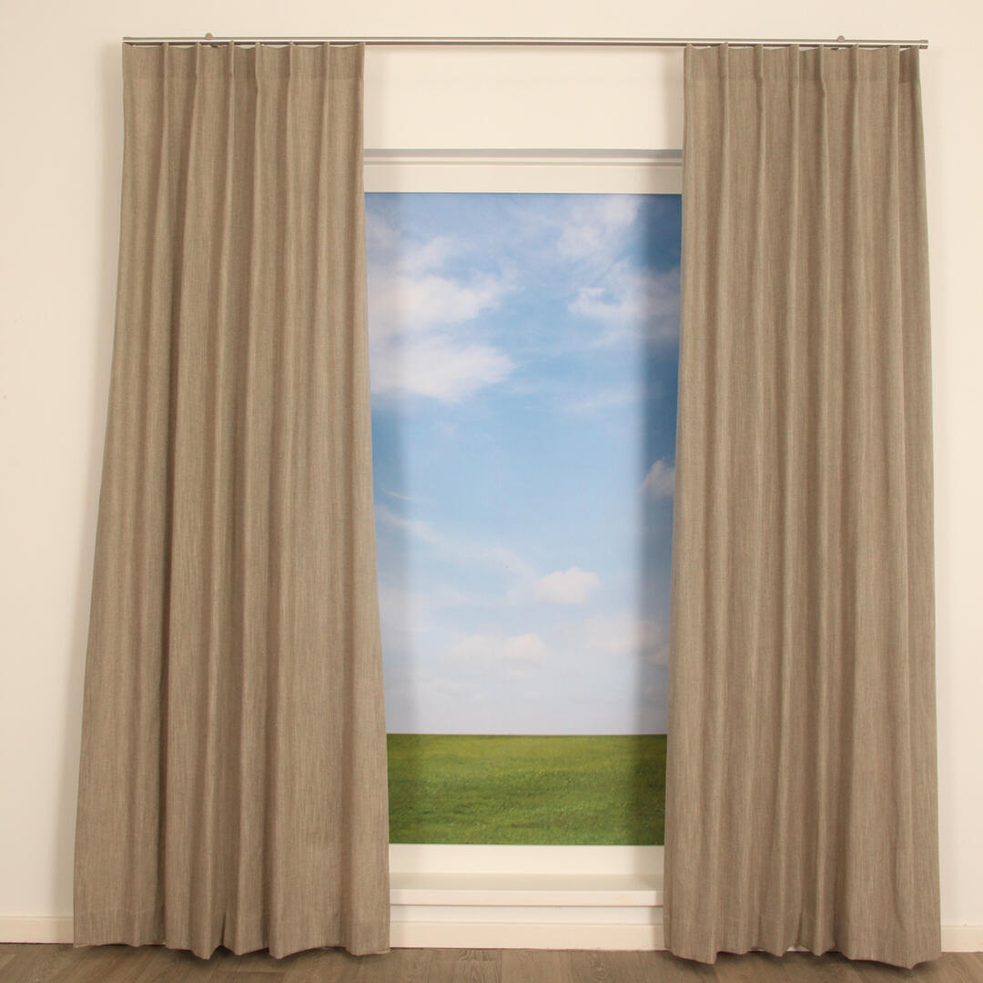 Overgordijn Youghal is een breedtestof van 135cm. Bij breedtestoffen word een verticale naad in het gordijn gemaakt op de plaats waar de banen aan elkaar gezet worden.