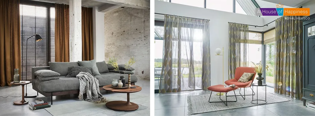 Het industriële interieur komt voort uit de 19e en 20e eeuw en heeft iets weg van fabrieksgebouwen. In dit type interieur zijn duidelijk ‘bouwkenmerken’ te zien. De uitstraling van deze woonstijl is stoer en robuust. Ze worden vaak gekenmerkt door zichtbare leidingen en bakstenen muren. De kleur gordijnen die wij adviseren, zijn gordijnen met donkere kleuren, zoals zwart en grijs. Een stof met een lichte glans zou heel goed staan binnen de industriële woonstijl. Deze interieurstijl kun je met veel verschillende stofsoorten combineren. Het belangrijkst is dat de kleur past bij de stijl. Binnen deze look passen ringen of wave gordijnen prima. Een stoere trekstang past ook mooi in deze look.