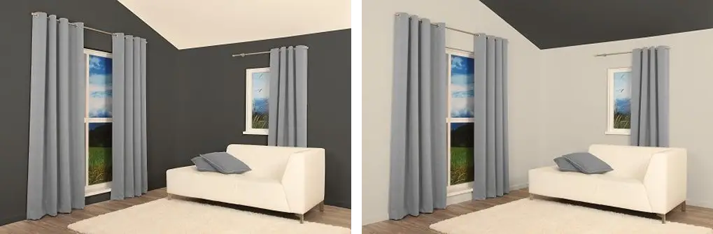 Wil je een ruimte breder laten lijken? Geef twee wanden die tegenover elkaar liggen een donkere en een lichte kleur, bijvoorbeeld donkergroen en wit. Je creëert zo een breder effect. Met gordijnen kun je dit effect ook bereiken. Heb je een grote raampartij of schuifpui? Hang je gordijnen dan over de gehele breedte van muur tot muur en kies voor een gordijn met een breedtestreep, zoals inbetween Raunds.