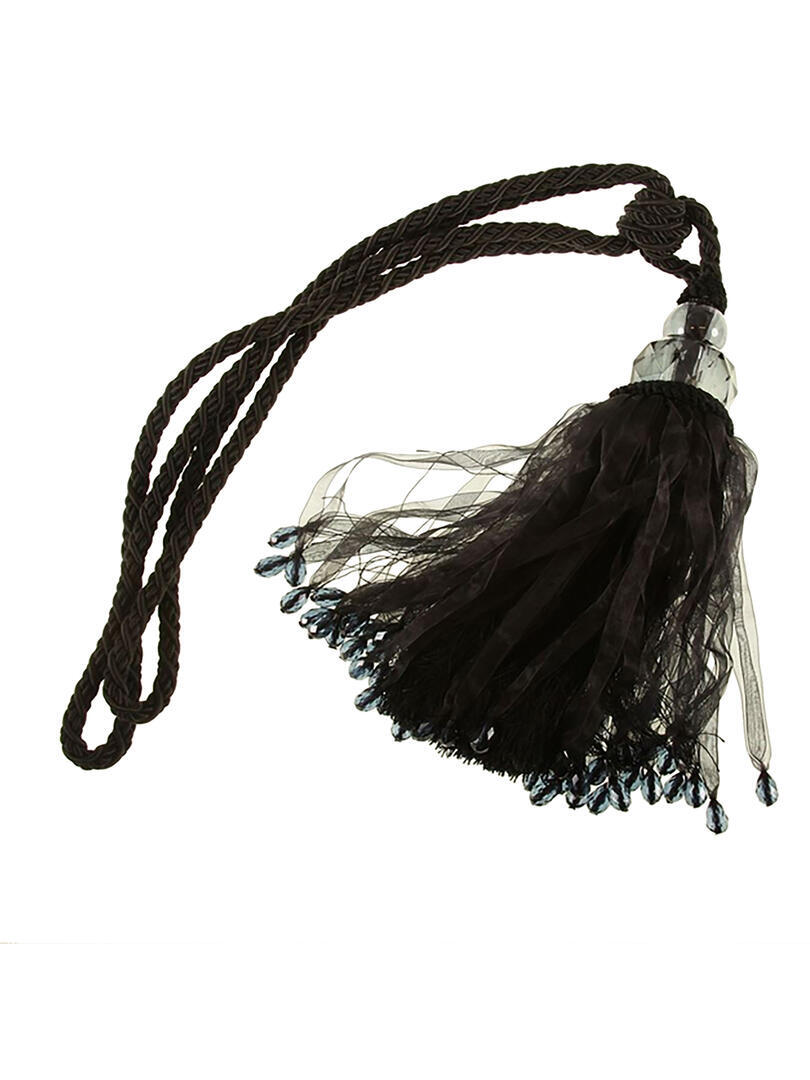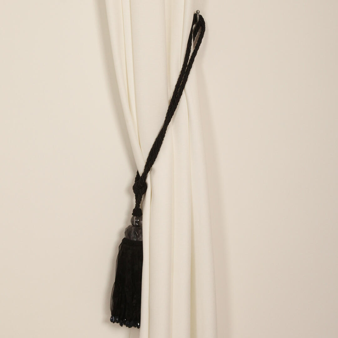 Glanzende zwarte embrasse van twee gedraaide koorden die samen komen in een knoop. Onder deze knoop hangt een kwast die aan de bovenkant voorzien is van twee kunststof kralen. De kwast zelf bestaat uit hele fijne zwarte glanzende draadjes met daar omheen een laagje van transparante zwarte linten.