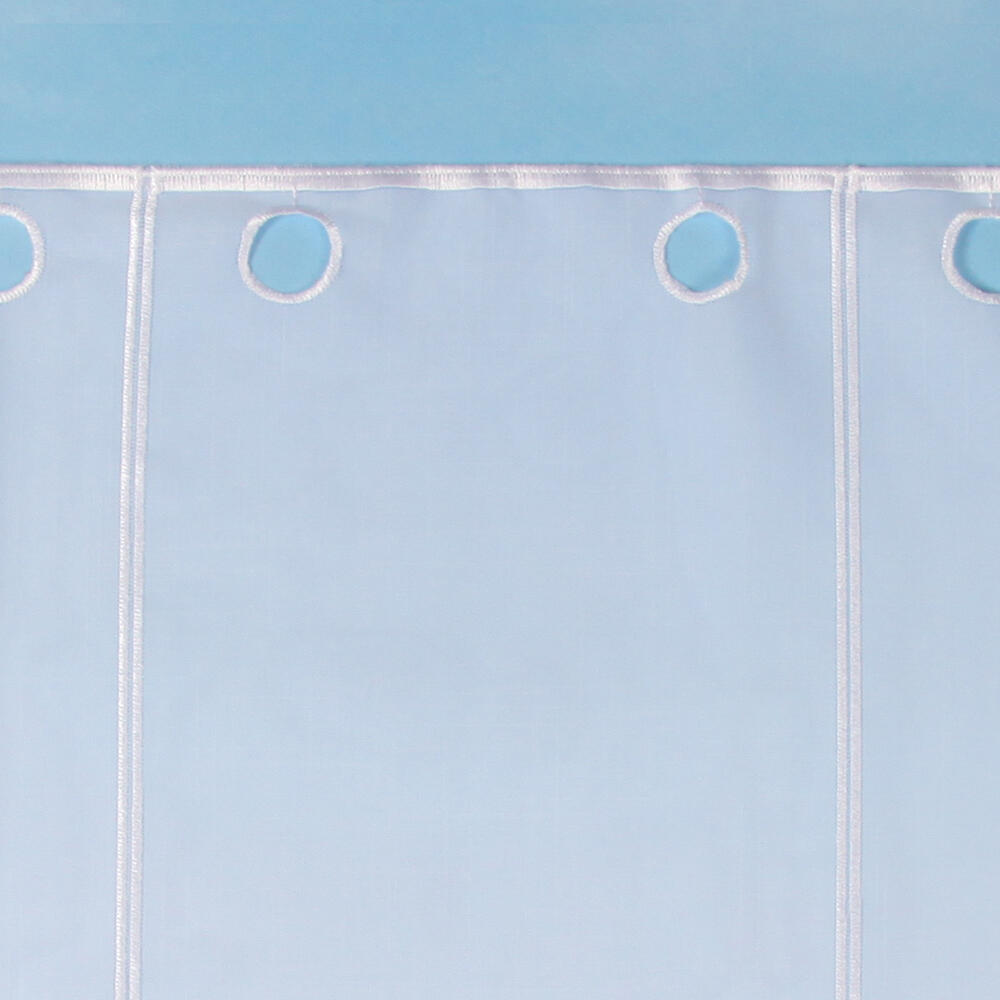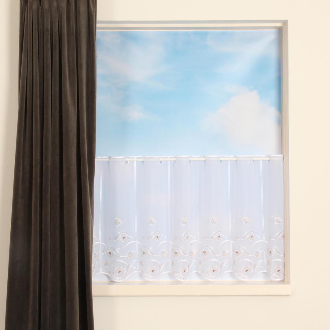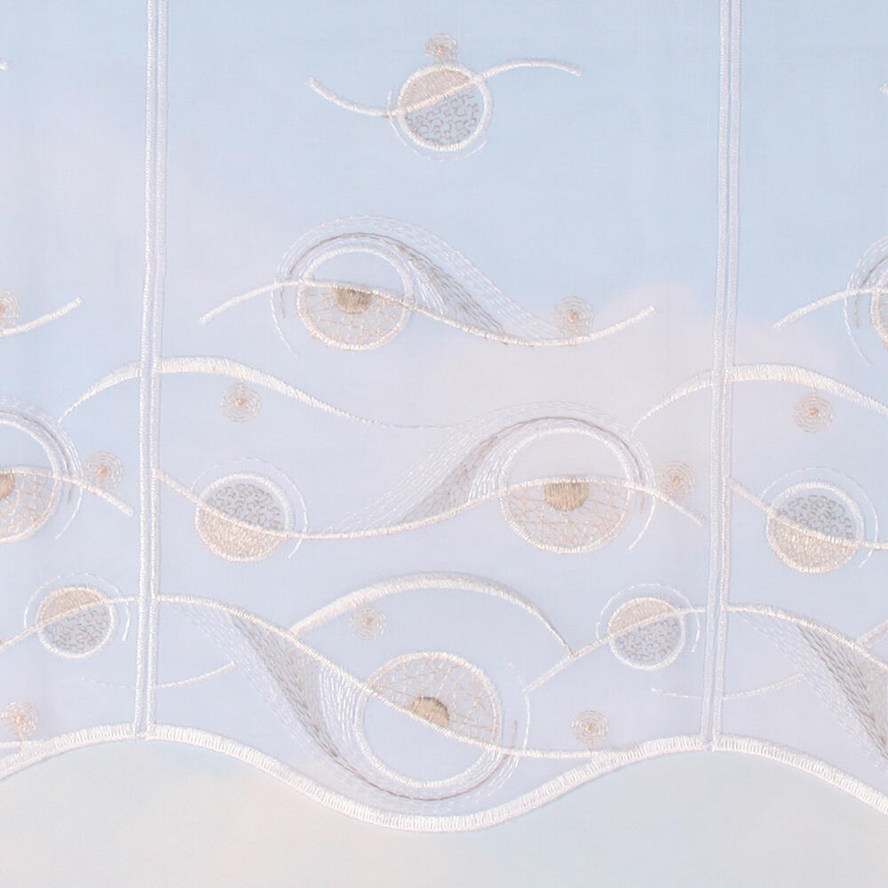 Deze Val van vitragestof is van een zeer soepele kwaliteit. Hij is rondom afgewerkt met glanzend wit garen. Voor het borduursel aan de onderkant zijn verschillende bruintinten gebruikt. Het patroon bestaat uit cirkels en golven. De paneelbreedte is 16 cm.